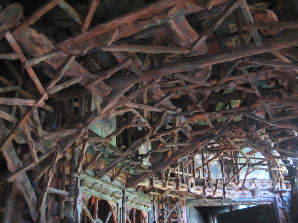 生き物の体内の様な、もしくは中世の骸骨寺やグロッタのような一面に施された彫刻と装飾。近くで見ると意外と力強く無骨な彫り方だが、全体を見たときのなんて繊細なこと。特に1階廊下の天井部分やソファの背の透かしの見事さ。彼の木工家具工としての経験が活きているのだろう。また抜群のバランスで構成された、赤や緑や青に着色された木々。正方形のプランにもストイックさを感じる。床の模様は見事なものなのに、所どころ天井に描かれた絵がかわいらしいのはご愛嬌か。