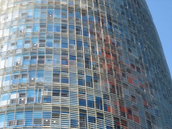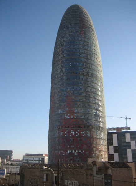 ガウディのサグラダ・ファミリア教会に登っている途中に、遠景に変な建物が見えたので「なんだあれは、あそこまで行ってみよう」というひどい動機で現地で急遽訪れることになったビル。そのときはジャン・ヌーベル作なことも知らなかった(言われてみればっぽい)。とにかくバルセロナの街の他の建物より飛び抜けて高く、その虫の卵のような特異な外観はとても目立ったのである。