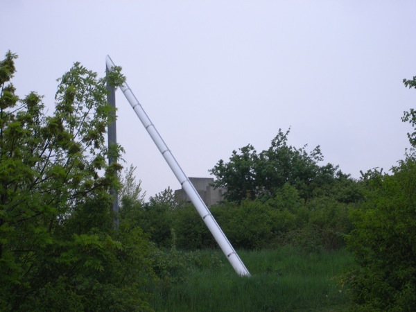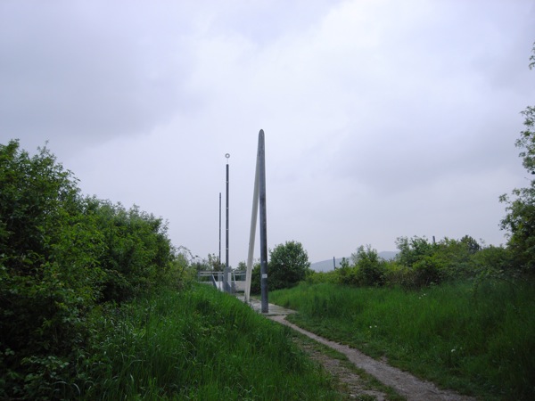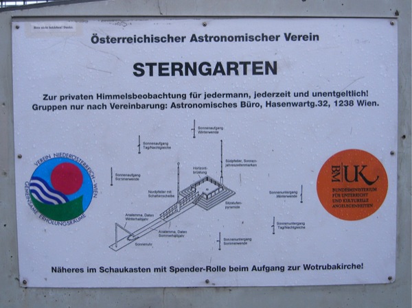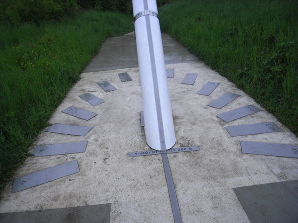 いろんなアングルから見たいので、教会の回りを一周しようと芝生に入ると、獣道のようなものが茂みの中に向かって伸びている。案内も何もないのだが、もしかしてビューポイントにでも連れて行ってくれるのだろうかと進んでみる。すると、その先に橋の頭のようなものが見える。なんだろう?と思い近づくと、儀式でもやりそうな謎の祭壇らしきものが現れる。さらに近づくと、それは大きな日時計だった。その先にある舞台はどうやら天体を見るためのステージらしい。ステージのまわりには夏至や春分などの時の日の出の方向を記したポールが点々と立っている。教会にこんなものが付いてると、私なんかは占星術との関係とかとかつい考えたくなってしまうのだが、まぁ普通の施設っぽい。舞台の横にはこじんまりとした芝生の広場ある。まわりはなにもないところなので、晴れた夜に来たらたしかにさぞ星が綺麗だろう。