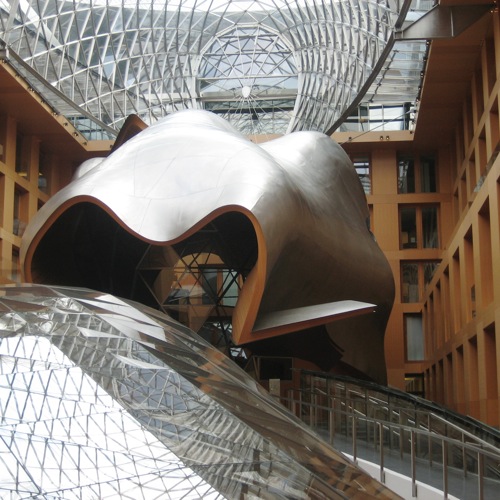 そっけいないファサードの銀行ビルに1歩入ると、ガラス屋根を通し日を浴びて銀色に輝くぐにゃぐにゃ会議場がお出迎え。