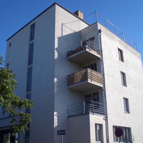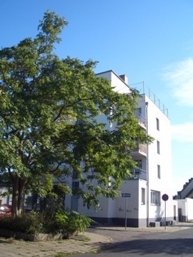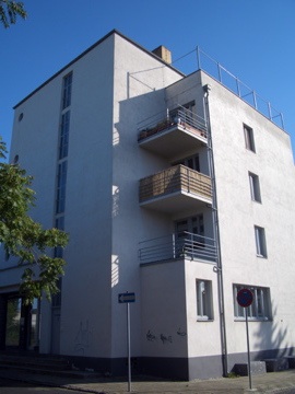さすが、ベランダのディティールなんかはバウハウス校舎と良く似ている。この辺はグロピウス流。1階のSchleckerのロゴはなんだかやたら建物に合ってるなぁと思った。建物の前の空間が芝と木で緑が多いのが良い。