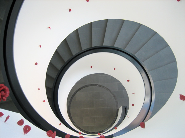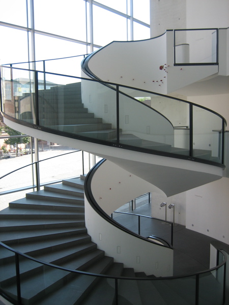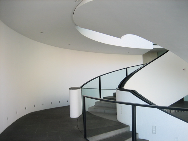 美術館を入った吹き抜けにある螺旋階段がとにかく美しい。広いガラス窓を伴った開放的な吹き抜けの隅にちょこんとたたずんでいる。若干グレーがかったガラスと華奢な黒枠が、白い館内を引き締めつつもシャープな軽やかさを保つ。スケールも、仰々しくなく、かといって小振りすぎずちょうど良い。さらに、実際にこの螺旋階段を登ると(鑑賞の際はほぼ必ずこの螺旋階段を使用することになる)、徐々に上がりながら旋回することで美術館内とガラス越しの広場を向後に見渡すことになる。この視線の移動がたのしい。段差が一定テンポで無粋な折り返し部分がないことで、周りを見ることに集中できるのも螺旋階段の利点だと感じた。訪問時、螺旋階段の内側に赤い薔薇の花びらが散らしてあったのだが、これは特設であろうか?