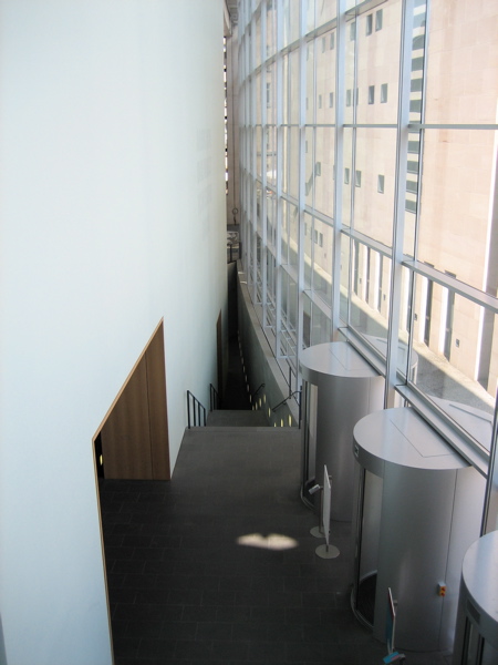 まず、目に入るのは一面のガラス張りとそれを通して見える中の美術作品。もちろん総ての作品が見えるわけではないが、外から既に見えてしまうのが良い。単純に言えば太っ腹感を感じるし、外部に対する広告効果や美術作品に対する公共性も感じる。