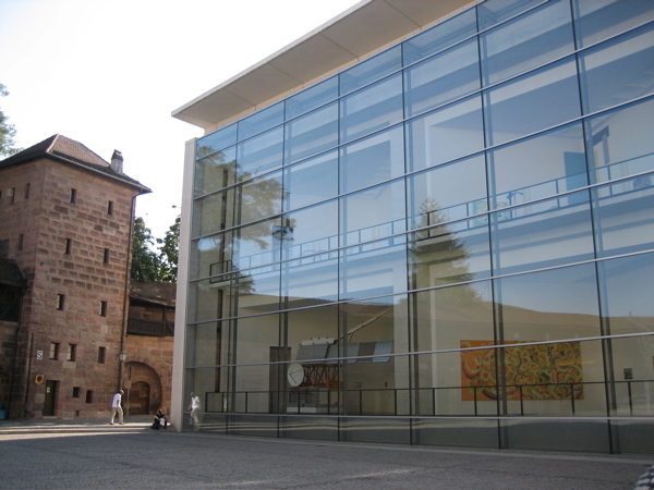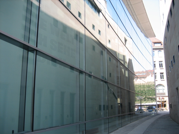 今回ドイツをまわる機会を得たので今こそその時と意気揚々と旅程にニュルンベルクを組み込んだのだが、いざ旅程を組み宿を取ってからその件の美術館の場所を調べよとしたら、どこにもそれが載っていない。おぼろげな記憶から辿ったせいもあるが、観光ガイドでも、ニュルンベルク市のサイトをはじめとするwebサイトでもそれを見つけることができなかった。そんなはずは……と思いつつも結局「私の脳内美術館だった」という結論に達し「まぁ、Nürnbergは古都だし(初ニュルンベルクになる同行者の)観光には良いか」とニュルンベルクは観光訪問と割り切っていた。しかし、いざニュルンベルクに行ってみたらやっぱりそこに現代美術館はあった。市街をふらふらしてたらいきなり目の前に現れる一面ガラス張りの建物。なんだ、やっぱりあるんじゃないか。