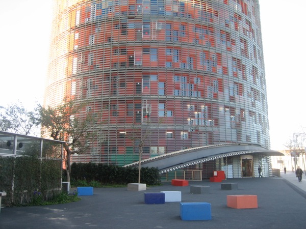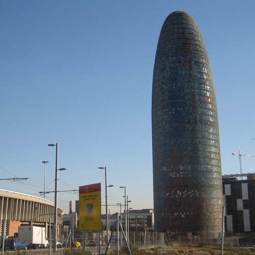 バルセロナ水道局のオフィスビル。高さ144.4mでバルセロナ市内では飛び抜けて高い。蝶のタマゴのような特徴的なフォルムを持ち、カラフルな原色が塗られた建物表面のまわりはガラスルーバーで覆われている。