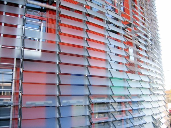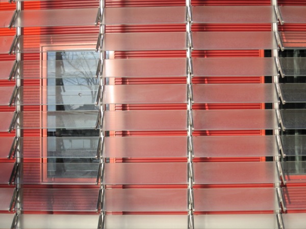 いざ近くで見ると、ひたすらにガラスのルーバーで覆われたとても愉快なファサード。赤と青のハレーションの組み合わせは目立つがきれいで、ガラスがそれを少々マイルドにしている。HdeMの作品なんかもそうだが、こういった外装のまわりにまたもう1重ベールがかかっているタイプの建築はつかみどころがない。