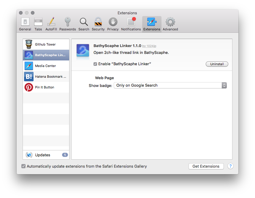 ウェブページ上の2ちゃんねる・PINKちゃんねる・まちBBS・したらば掲示板へのリンクをBathyScapheで開くようにするSafari機能拡張 (Safari Extension) です。